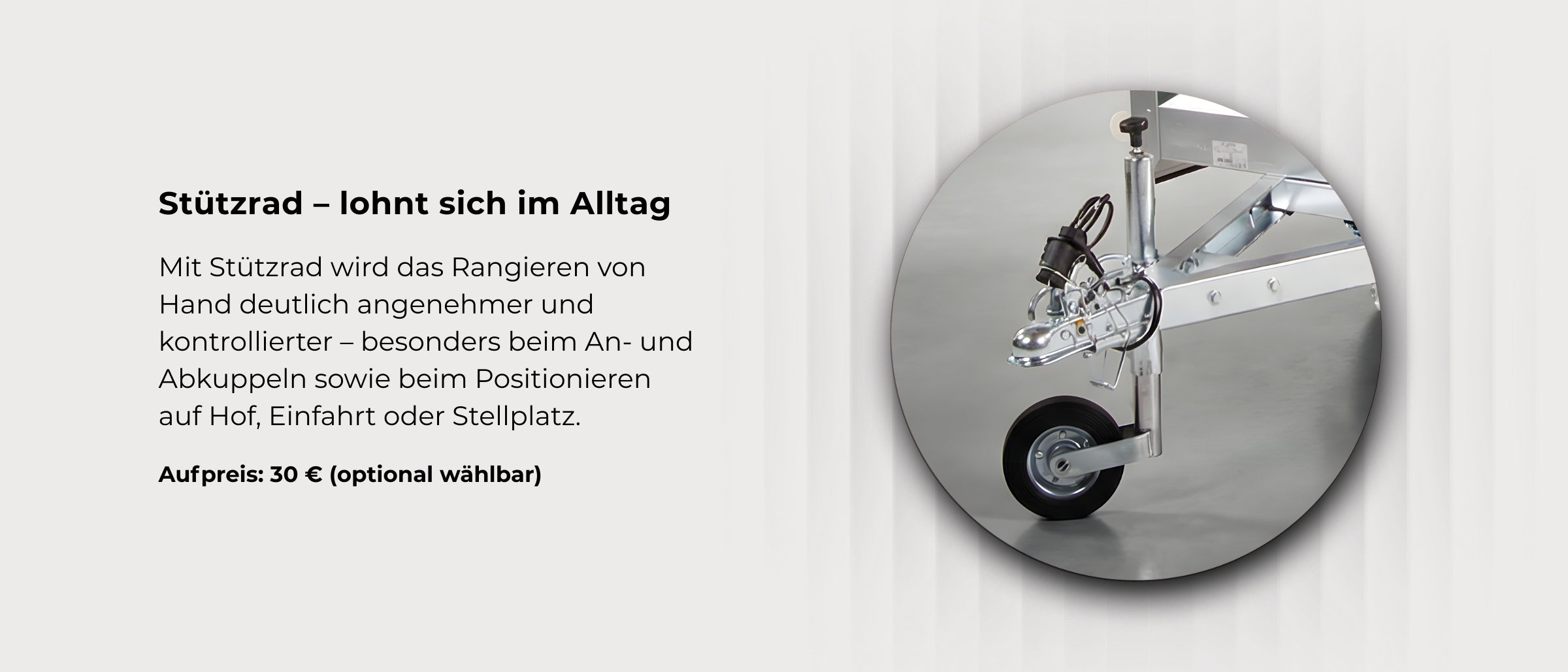 Ein Stützrad macht An- und Abkuppeln sowie Rangieren von Hand deutlich einfacher und kontrollierter (besonders auf Hof/Einfahrt/Stellplatz).